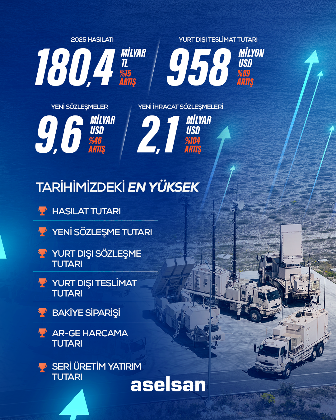 ASELSAN, 2025 yılında küresel pazarlardaki etkinliğini önemli ölçüde artırarak uluslararası savunma ekosistemindeki konumunu daha da güçlendirdi. Yıl içerisinde özellikle ÇELİKKUBBE projesine yönelik imzalanan sözleşmeler alınan işler içerisinde önemli bir pay oluşturdu. ASELSAN’ın 2025 yılında imzaladığı yeni sözleşmeler %46 artışla 9,6 milyar ABD dolarına ulaştı. Yeni siparişlerin 2,1 milyar ABD dolarlık kısmının ihracat kaynaklı olması ve ihracat sözleşmelerindeki yıllık artışın %106 seviyesinde gerçekleşmesi, ASELSAN’ın ürün ve sistemlerine yönelik küresel talebin istikrarlı şekilde arttığını ortaya koydu.
