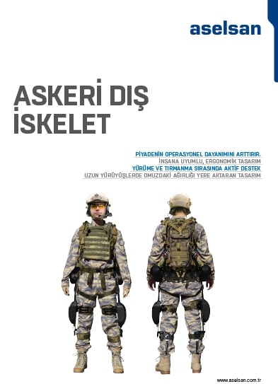 ASKERİ DIŞ İSKELET, ASELSAN tarafından kara güçlerinin operasyonel ihtiyaçları doğrultusunda geliştirilen, askerin intikal görevleri esnasında taşıdığı ağır yükleri hafifletip, aktif destek özelliğiyle dayanımını arttırmak amaçlı olarak tamamen milli imkân ve kabiliyetlerle tasarlanmış bir sistemdir.